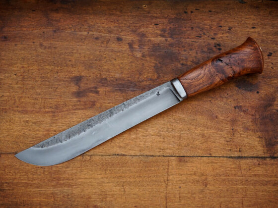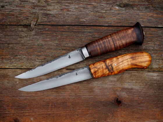 Elle met en valeur le bouleau de Finlande, teinté avec un mélange que j’ai moi-même concocté. Chaque couteau est monté en soie traversante matée, assurant une solidité maximale et une cohérence historique. Je choisis les meilleures nuances d’acier pour proposer une tenue de coupe exceptionnelle et une résistance à toute épreuve. Mon objectif est de rendre hommage à l’âge d’or de la coutellerie scandinave, tout en insufflant une touche personnelle à chaque pièce.