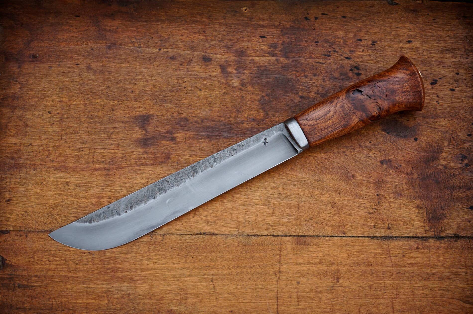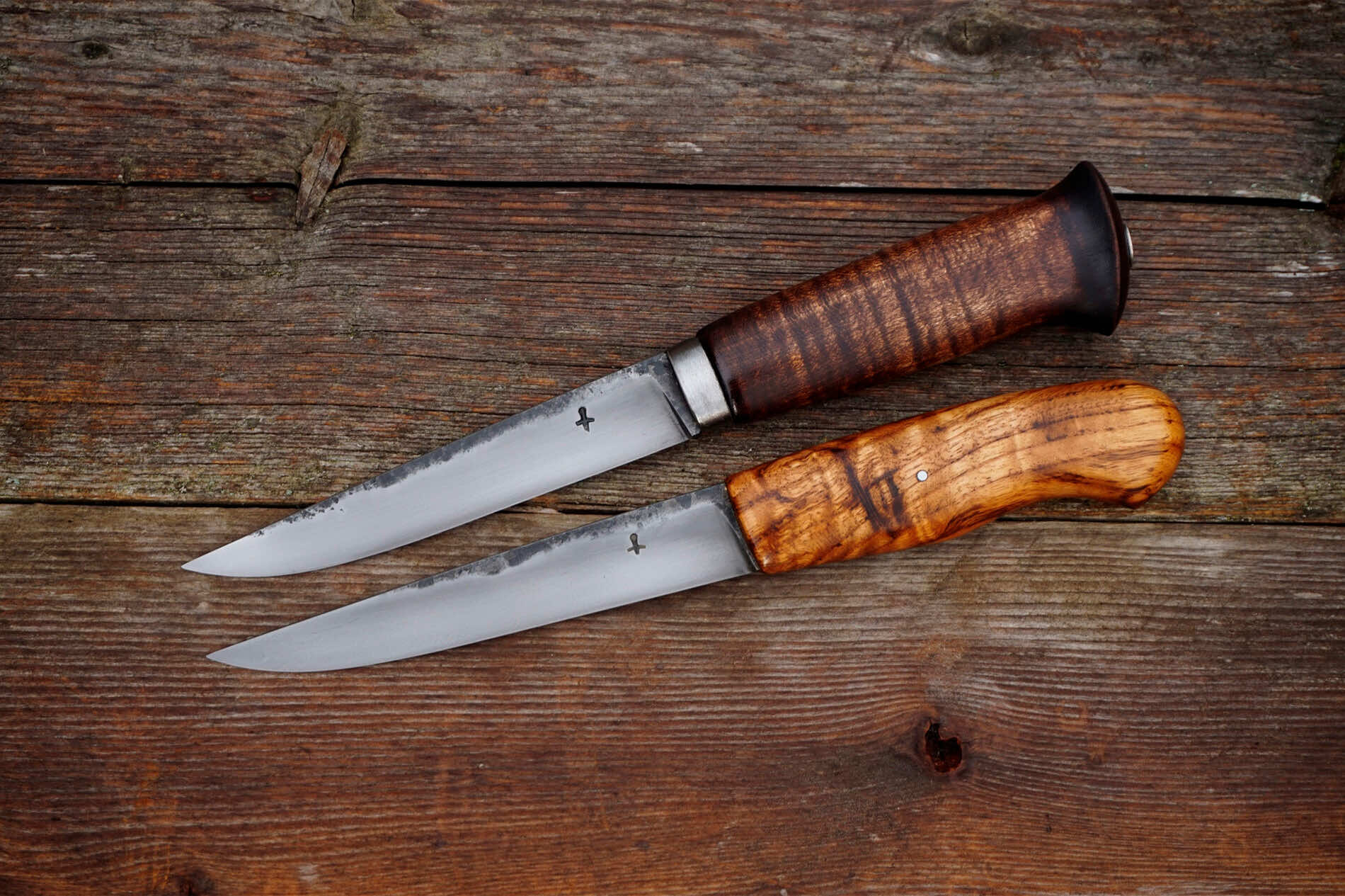 Elle met en valeur le bouleau de Finlande, teinté avec un mélange que j’ai moi-même concocté. Chaque couteau est monté en soie traversante matée, assurant une solidité maximale et une cohérence historique. Je choisis les meilleures nuances d’acier pour proposer une tenue de coupe exceptionnelle et une résistance à toute épreuve. Mon objectif est de rendre hommage à l’âge d’or de la coutellerie scandinave, tout en insufflant une touche personnelle à chaque pièce.